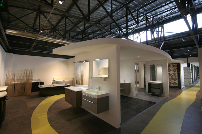 Rénovation et agencement d'un Show Room carrelage et sanitaire (ERP). Travaux en deux tranches, en site occupé. Désamiantage, changement de la couverture, isolation et bardage, renforts de structure, création de mobilier et luminaires.