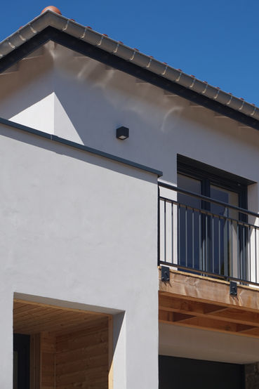 Construction en maçonnerie et bardage bois + enduits, dallage surfacé. Terrasse et balcon.